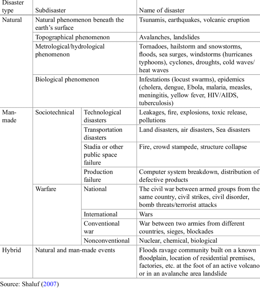 - Natural Disasters: They are caused by natural phenomena (meteorological, geological or even biological origin). Examples of natural disasters are cyclones, tsunamis, earthquakes and volcanic eruptions which are exclusively of natural origin.