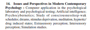 - Issues and Perspectives in Modern Contemporary Psychology: Computer application in the psychological laboratory and psychological testing; Artificial intelligence; Psychocybernetics; Study of consciousness sleep-wake schedules; dreams, stimulus deprivation, meditation, hypnotic/drug induced states; Extrasensory perception; Intersensory perception; Simulation studies.